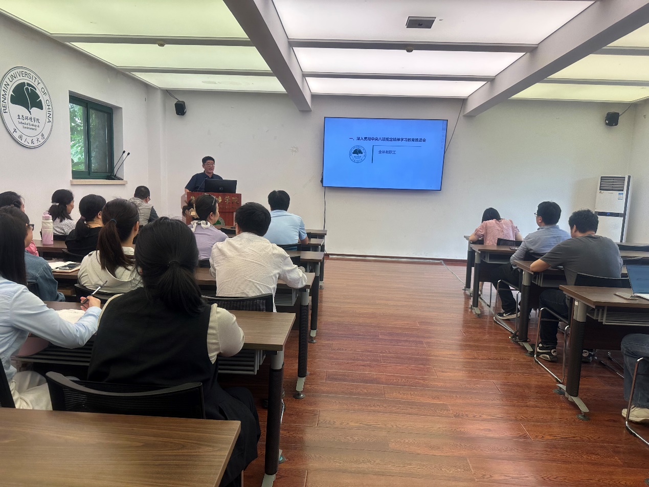 随后,贾铁英对学院贯彻落实中央八项规定精神提出三点要求。一是坚决杜绝铺张浪费现象,要求全体教职工在办公、教学、科研等各项工作及生活中,从节约一张纸、一度电做起,养成勤俭节约的良好习惯,树立绿色低碳的生活和工作理念;二是切实注意生活工作作风,尤其党员同志要以身作则,严守纪律规矩,时刻保持良好的精神风貌,做到言行一致、表里如一,坚决抵制不良风气,树立清正廉洁、务实高效的形象;三是规范新闻媒体采访报道形式,要求教职工在撰写新闻稿时,严格遵守相关规定,合理把控报道篇幅,注重内容的真实性、准确性和导向性,充分展现学院在生态环境保护领域的科研成果与教学成效,传播学院正能量。