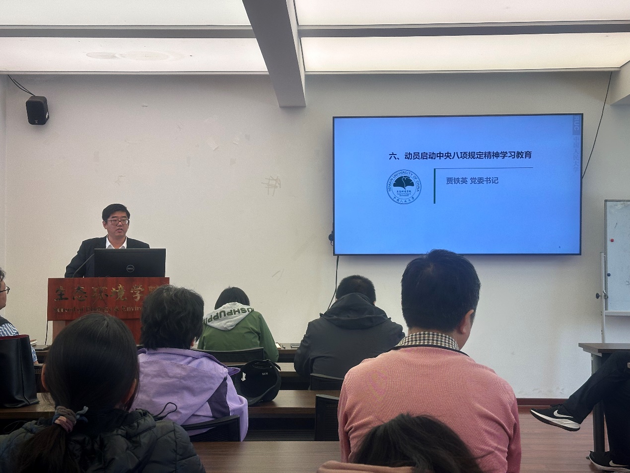 会上,党委书记贾铁英传达了《中共中央办公厅关于在全党开展深入贯彻中央八项规定精神学习教育的通知》精神和学校党委关于开展学习教育的相关要求。贾铁英强调,全院教职工,尤其是党员同志,要充分认识学习深入贯彻中央八项规定精神的重要性,要将这次深入贯彻中央八项规定精神学习教育作为巩固深化主题教育和党纪学习教育成果、纵深推进全面从严治党的重要活动,准确把握其核心要求,对标学校党委设计开展的六大专项行动,统筹推进学习研讨、查摆问题、集中整治、开门教育,做到有机融合、贯穿始终,以高度的政治自觉和务实的行动措施推动学习教育走深走实。
