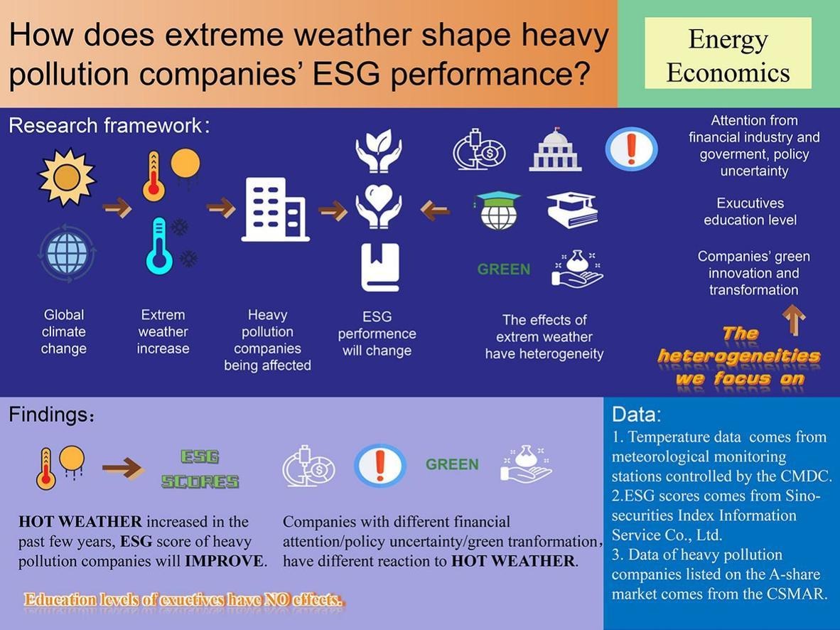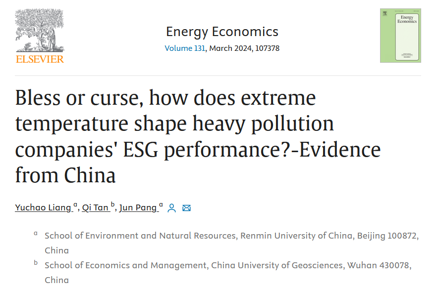 近日,环境学院博士研究生梁宇超在能源经济学领域国际权威期刊Energy Economics发表学术论文。该论文题为“Bless or curse, how does extreme temperature shape heavy pollution companies’ ESG performance?-Evidence from China”。黑料正能量 环境学院为第一作者单位,人口、资源与环境经济学2022级博士研究生梁宇超为第一作者,环境学院庞军教授为论文通讯作者。