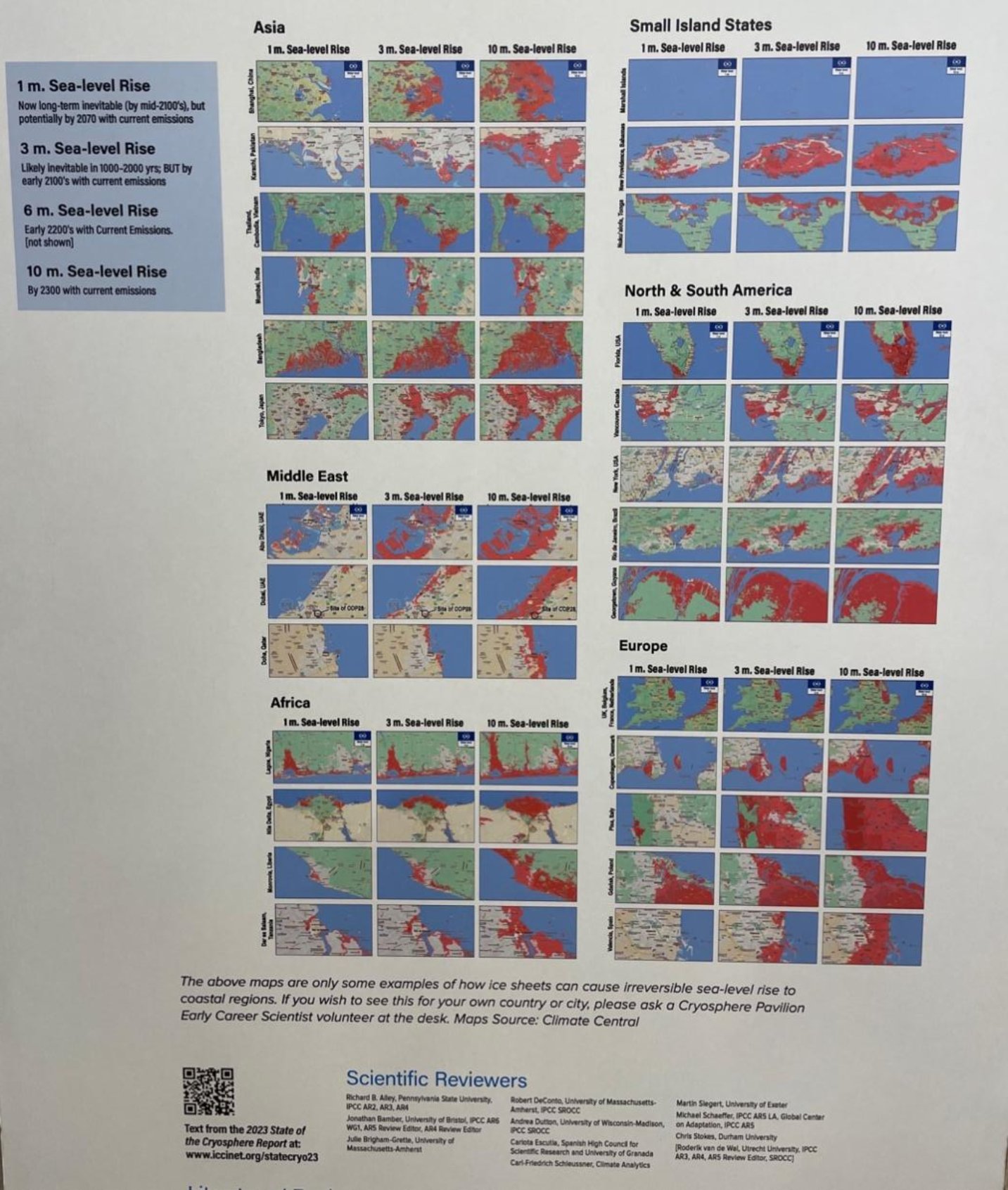 相似的认知也适用于冰冻圈。气候变暖加速了海冰和大陆冰川的消融,科学家正尝试探索冰冻圈融化与海平面上升之间的传导关系,如在哪条温升路径下,冰冻圈的融化会大概率在多少年内造成某海滨地区占比多大的陆地被淹没;此外,定点的大陆冰川监测也成为了目前最常用的监测气候变暖的手段之一,而以冰川和某些如北极熊或企鹅等冰冻圈旗舰物种为媒介推动气候变化认知的主流化,也是当前非常直观和普及度高的宣传方式;冰冻圈的消失也会影响气候变化的速率,研究正在尝试探索出这一确切的影响机制并对其量化,如消失多少的白色陆域会使同样的温室气体排放量的温升影响加重多少。