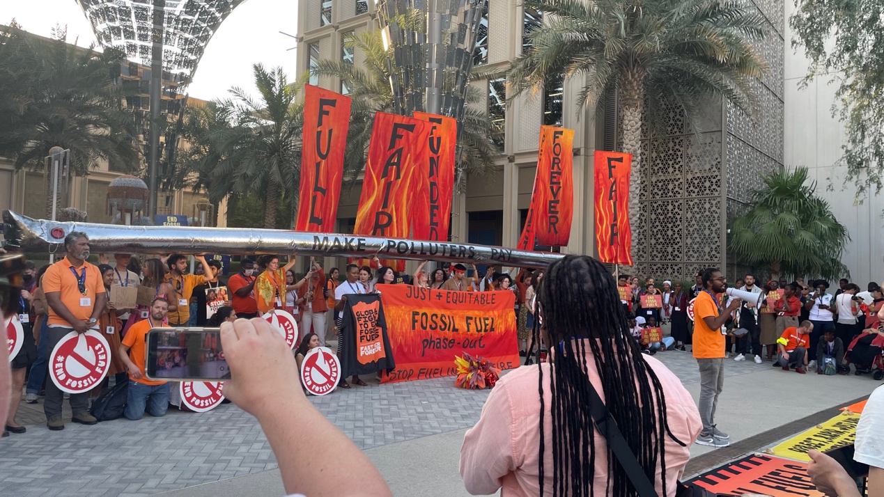 (COP28室外区域,主张“公正地淘汰化石燃料”的气候活动组织进行有关话题宣传)