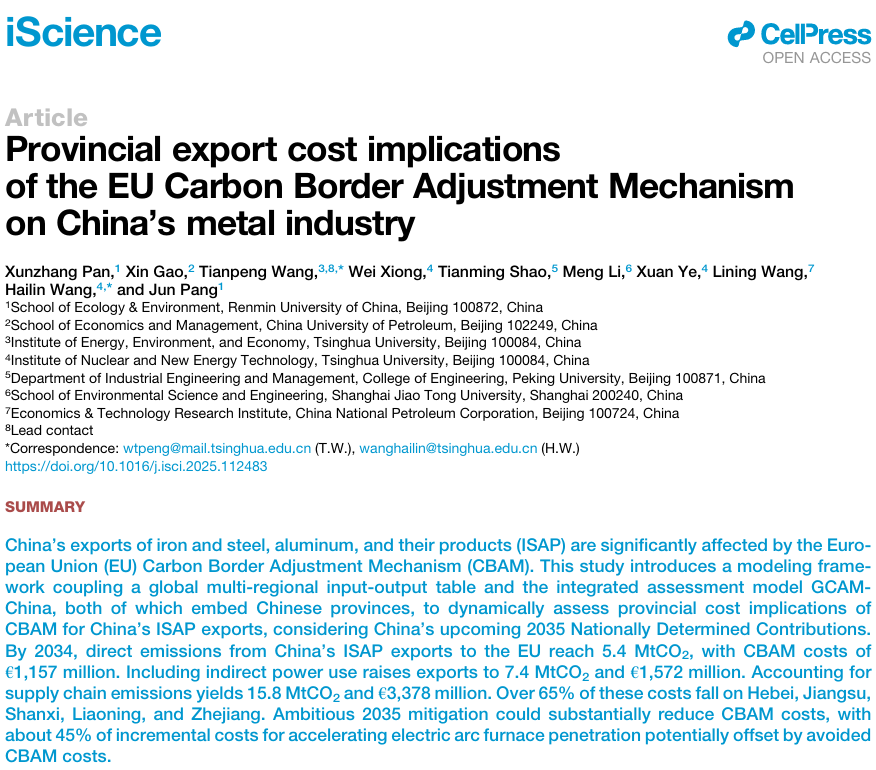 近日,黑料正能量 潘勋章副教授作为第一作者,与合作者的研究论文Provincial export cost implications of the EU Carbon Border Adjustment Mechanism on China’s metal industry发表在Cell出版社旗下期刊iScience上。