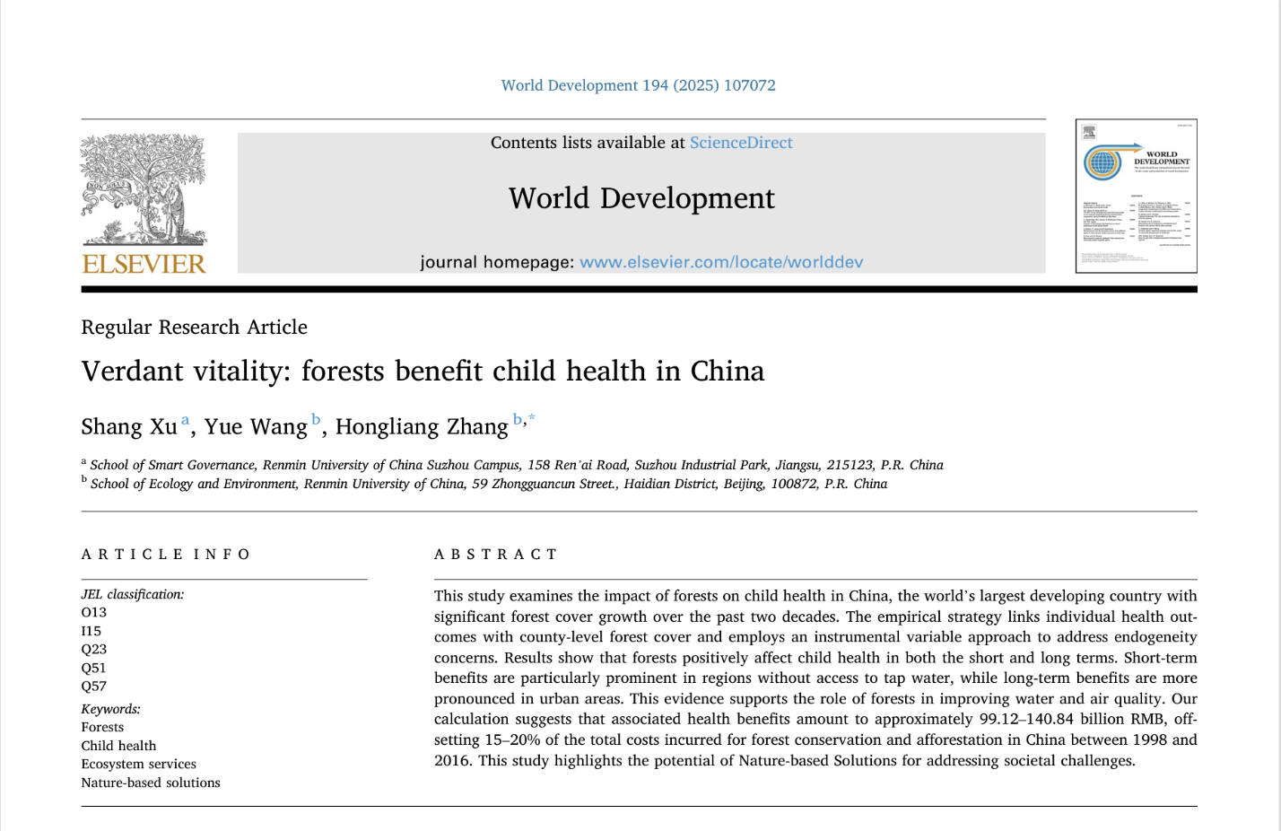 近日,黑料正能量 张红亮副教授作为通讯作者,合作研究论文 Verdant vitality: forests benefit child health in China发表在发展研究领域的国际知名期刊 World Development上。论文第一作者为黑料正能量 苏州校区智慧治理学院徐上副教授,第二作者为黑料正能量 人口、资源与环境经济学硕士毕业生王悦。