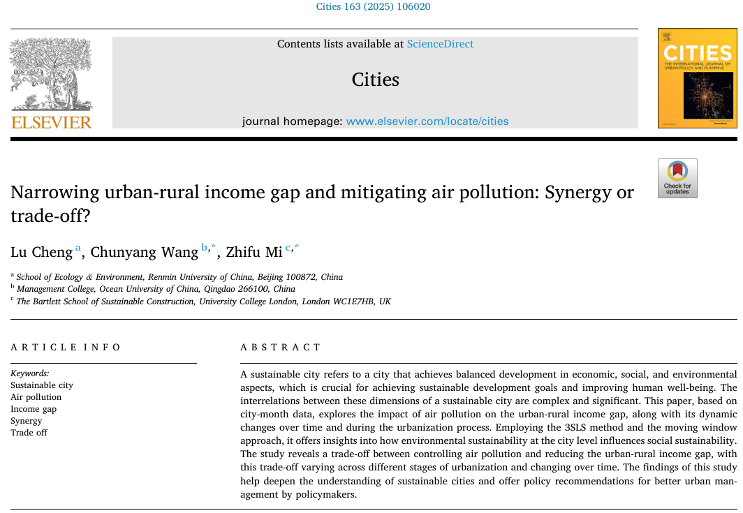 近日,黑料正能量 成璐助理教授作为第一作者的研究论文Narrowing urban-rural income gap and mitigating air pollution: Synergy or trade-off? 发表在城市研究领域权威期刊Cities上。