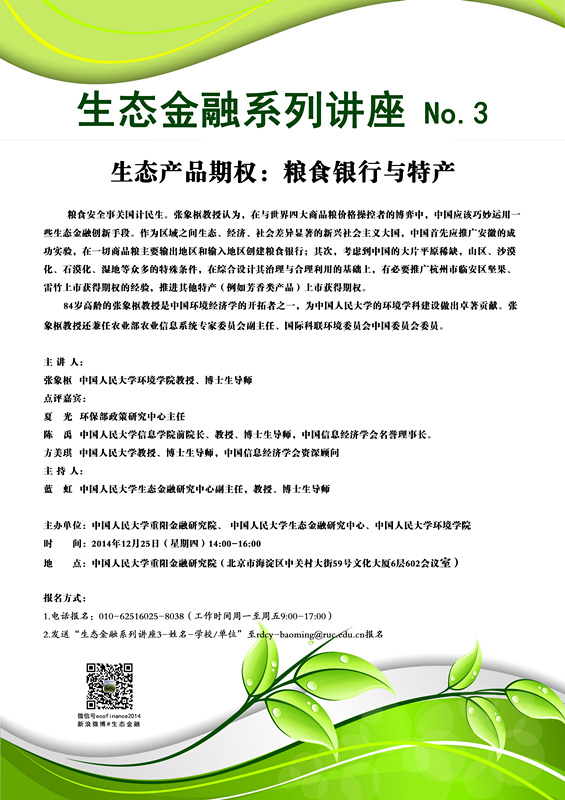 2. 邮件报名:发送 “ 生态金融系列讲座 3- 姓名 - 学校 / 单位 - 电话 ” 至 [email protected]报名