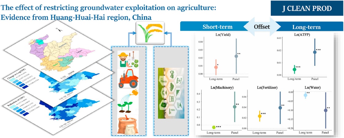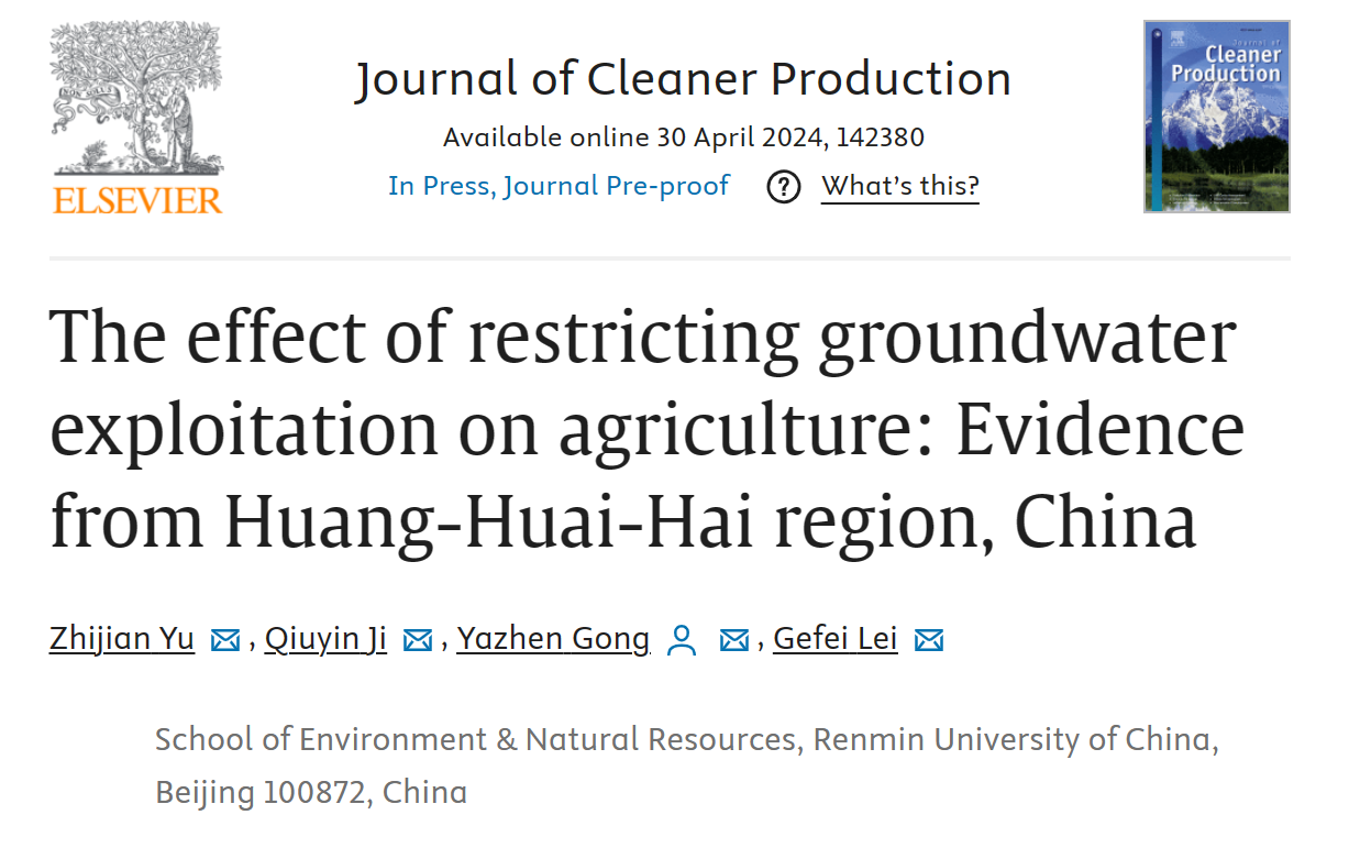 近日,生态环境学院龚亚珍教授团队的研究成果The effect of restricting groundwater exploitation on agriculture: Evidence from Huang-Huai-Hai region, China被国际期刊Journal of Cleaner Production接收。龚亚珍教授为论文通讯作者,团队内本科生季秋吟与博士生喻智健为论文共同第一作者,博士生雷格菲也是作者之一。根据2023年《中国科学院文献情报中心期刊分区表》显示,Journal of Cleaner Production期刊位于环境科学与生态学1区,影响因子为11.1。该工作也是龚亚珍教授主持的国家重点研发计划课题“地下水超采综合治理战略与管控策略”的阶段性成果之一(2021YFC3200500)。