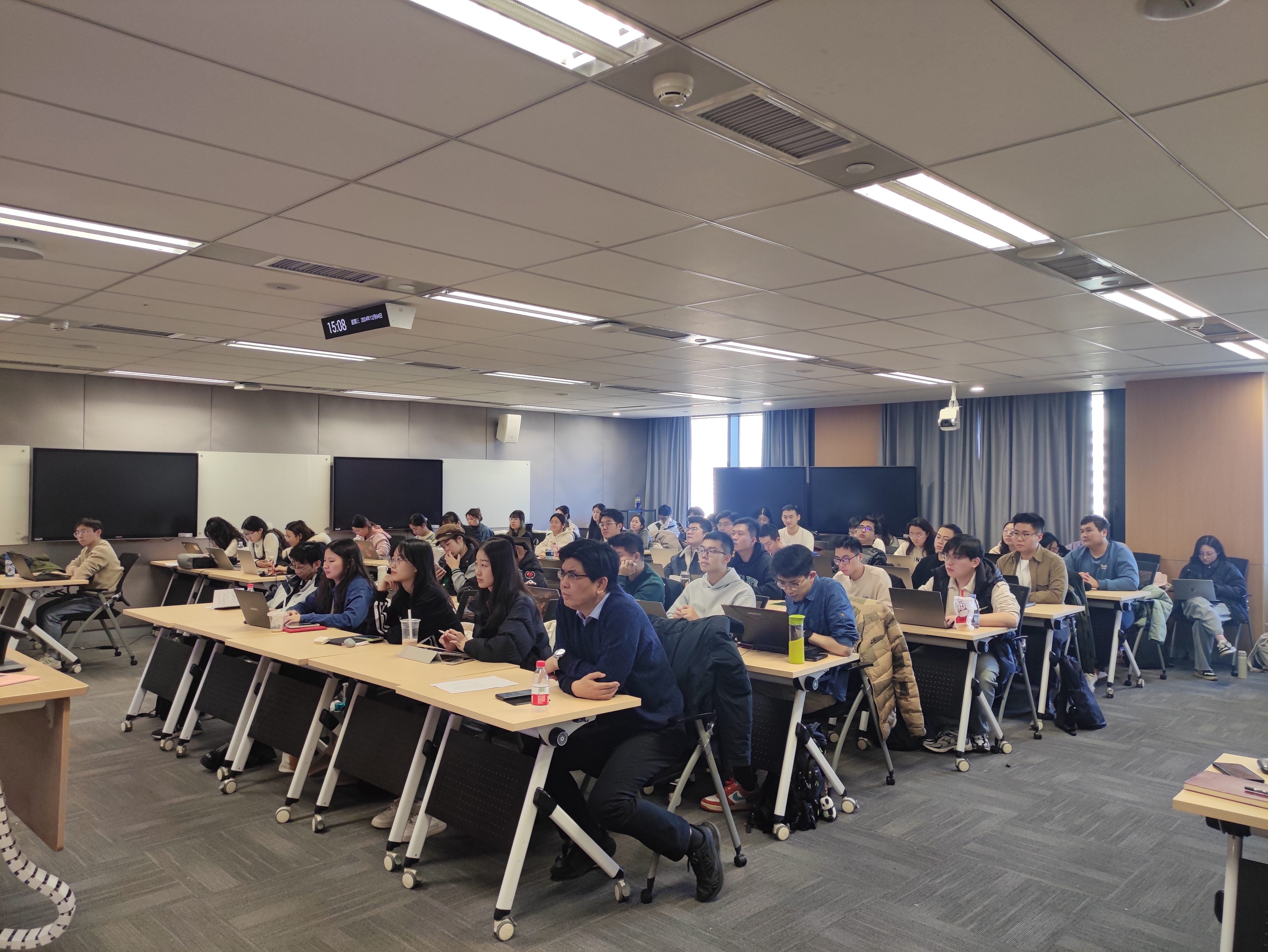 在交流讨论环节,多位师生针对学术报告中关于电力市场如何满足电力系统的灵活性、储能在电力行业产业链中的定位、储能的费用分担、V2G技术的可推广性、电力市场和碳市场耦合等问题,与孙传旺教授进行了深入探讨,气氛活跃,师生反响热烈。