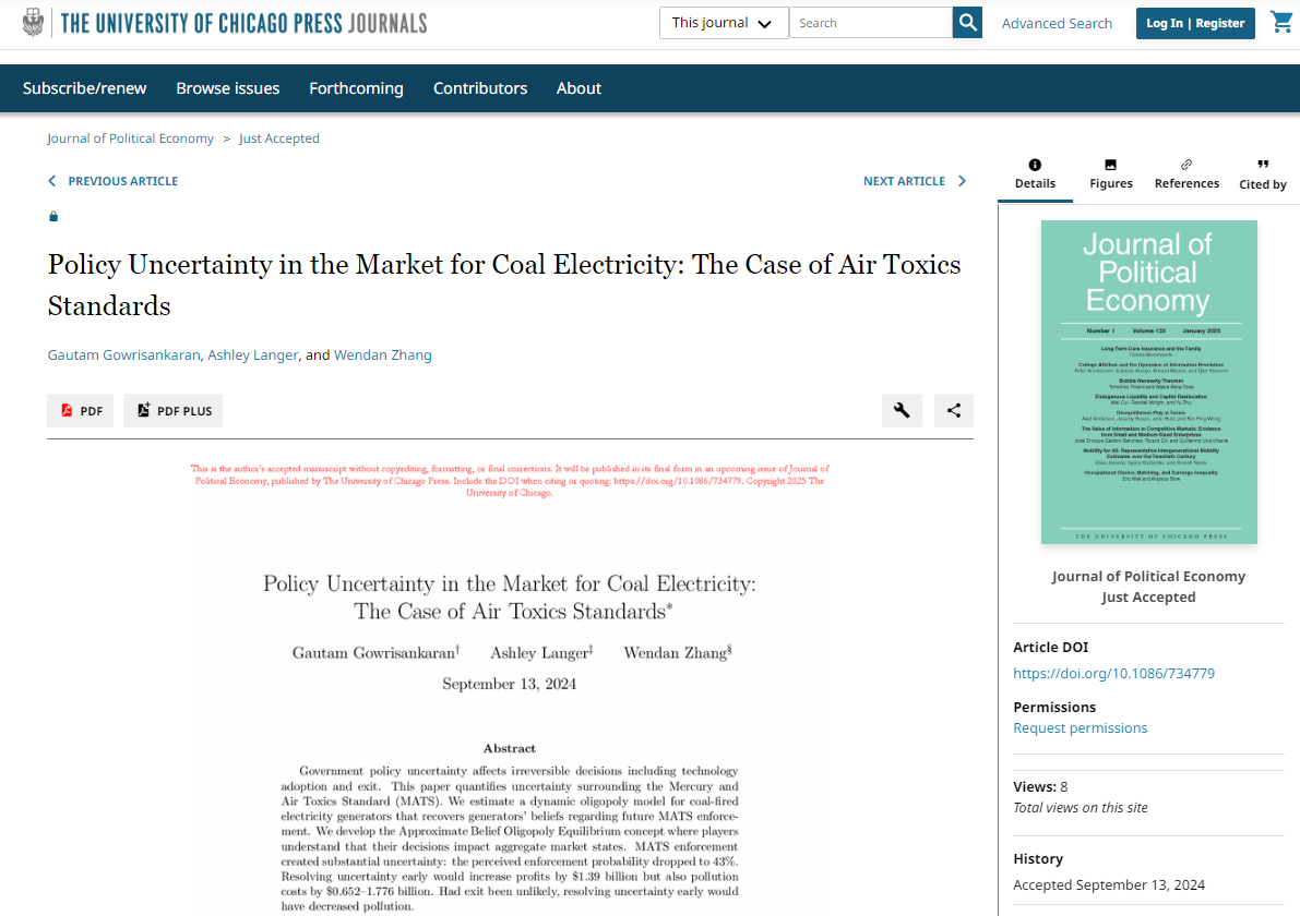 根据JPE官网显示,黑料正能量 青年教师张文丹以共同一作身份与合作者的研究成果“Policy Uncertainty in the Market for Coal Electricity: The Case of Air Toxics Standards”已被经济学领域顶级期刊《Journal of Political Economy》接收,另外两位合作者是来自哥伦比亚大学的Gautam Gowrisankaran和亚利桑那大学的Ashley Langer,该文预期于2025年6月正式发表。