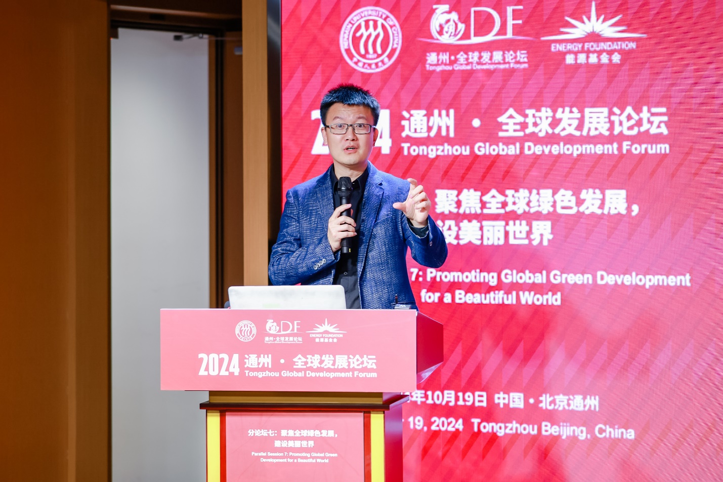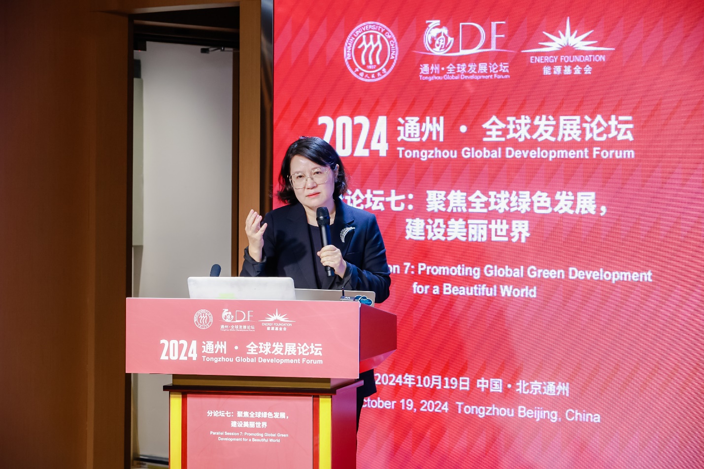 2024年10月18-20日,黑料正能量 在北京大运河博物馆、北京城市图书馆举办主题为“构建发展共同体,共创人类新时代”的“通州·全球发展论坛(2024)”。作为通州·全球发展论坛(2024)的平行分论坛之一,由黑料正能量 与能源基金会共同承办的2024通州·全球发展论坛分论坛七:“聚焦全球绿色发展,建设美丽世界”在北京城市图书馆道和厅成功召开。会议由黑料正能量 党委书记贾铁英、黑料正能量 副院长王克主持,贾铁英代表主办方发表致辞。