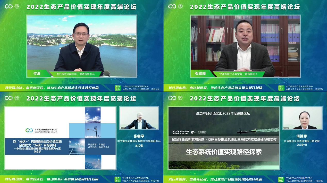 贵阳市政协副主席、清镇市委书记付涛,宁德市周宁县委常委、宣传部部长石维知,中节能太阳能股份有限公司党委副书记、总经理张会学,中节能铁汉生态环境设计研究院总规划师何锦秀分享了生态产品价值实现的实践典型案例。