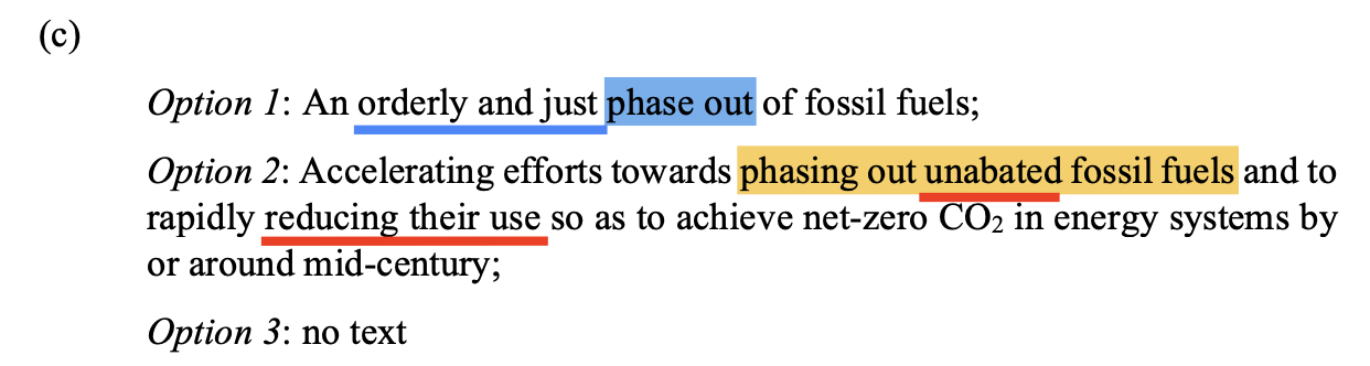 第二个议题——第一次全球盘点是本届COP最为关键的议题,与该议题相关的成果将被视为自《巴黎协定》以来COP最重要的成果。12月5日,框架公约附属科技咨询机构(SBSTA)联席主席发布了一份有关第一次全球盘点的待谈判草案,草案长达24页,共193项条款,有近200个段落。该草案是多轮高级别会议、联络小组会议和非正式磋商的成果,有关这份草案的谈判预计持续至会期最后几天,草案本身也将会成为此次大会的核心文件。但是,草案的用语基本上是较为宽泛和模糊的“共识性”语句,而非意义更大的“行动性”项目,这就为草案最终会带来的协议成果带来了比较大的不确定性。发达国家的历史责任、减缓实施的差距和资金缺口等重要问题在草案中得到了强调,这些内容的具体表述在谈判中也成为了代表们的主要交锋点,这种“字字必争”的特点让谈判变得有些像玩“文字游戏”。其中最具争议性的条款之一当属化石燃料的使用,也即到底是“淘汰(phase out)化石燃料”还是“逐步减少(phase down)化石燃料”,只有一词之差,但背后的含义大有不同。鉴于大会主席国阿联酋是石油出口国组织OPEC的核心成员,各方预期在该问题上依旧难以达成共识。