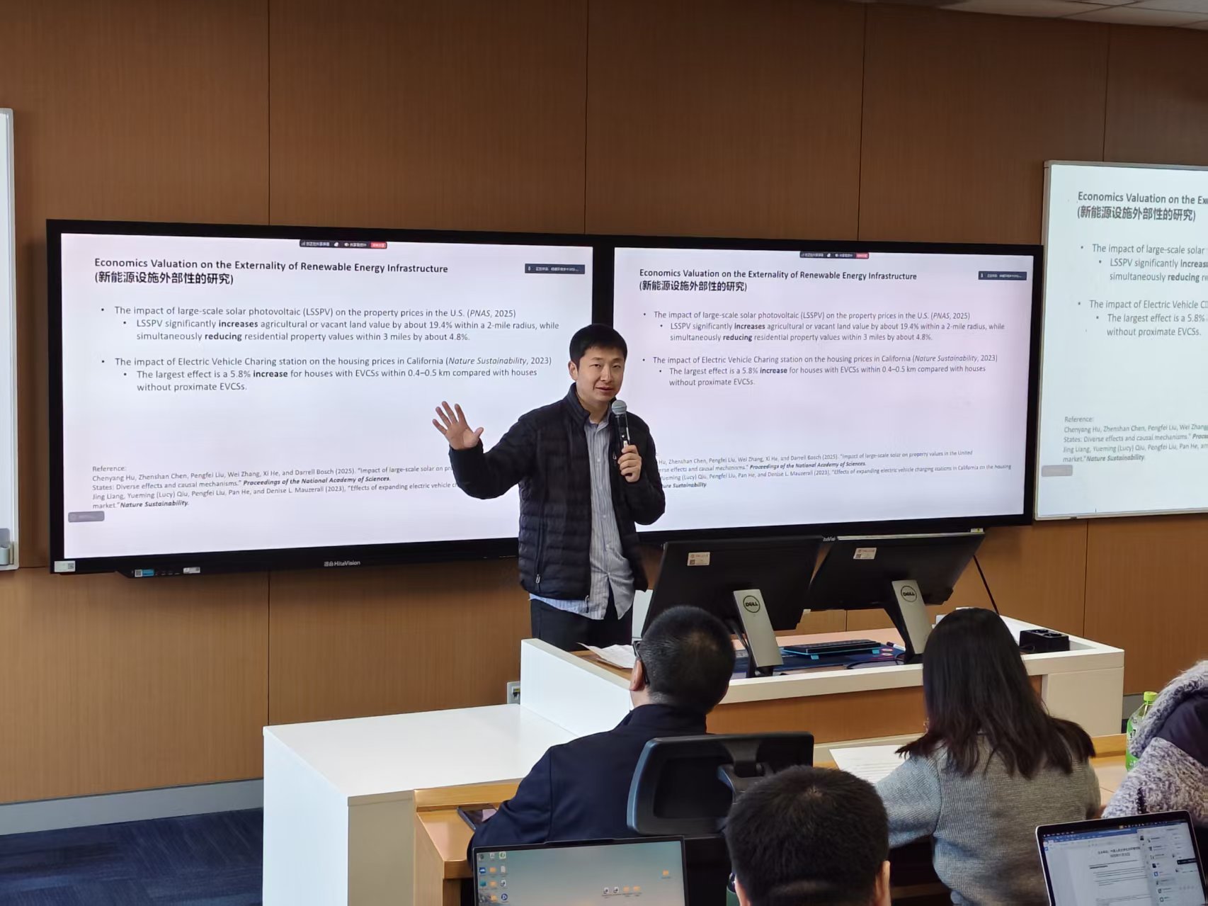 刘鹏飞教授进一步介绍了研究团队基于美国加州房产交易与充电基础设施布局数据开展的电动车充电设施研究。结果表明,合理布局充电站不仅可以提升周边房产价值,还通过推动电动车普及、改善局地空气质量,在经济与环境维度产生协同收益。在其他新能源基础设施外部性的研究进展中,刘鹏飞教授以“新能源设施外部性的经济估值”为主线,强调在统一框架下对不同类型新能源设施的正负外部性进行可比分析,为政府在选址、补偿与监管上的政策设计提供量化依据。