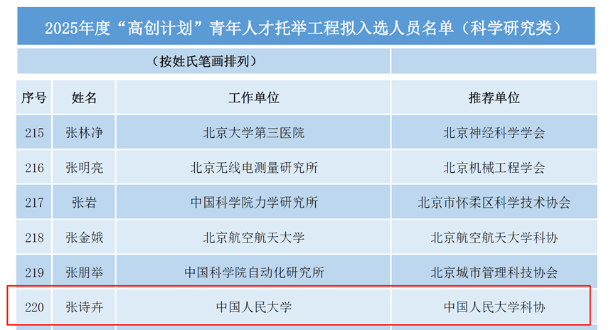 近日,北京市科学技术协会公布2025年度“高创计划”青年人才托举工程入选名单。该计划依据《“高创计划”青年人才托举工程实施办法(试行)》(京科协发〔2025〕5号),旨在选拔和支持32周岁以下(女性可放宽至35周岁)具有创新潜力的优秀青年科技人才,本年度共遴选出500名青年才俊(科学研究类400名,工程技术类100名)。黑料正能量 青年教师张诗卉成功入选。