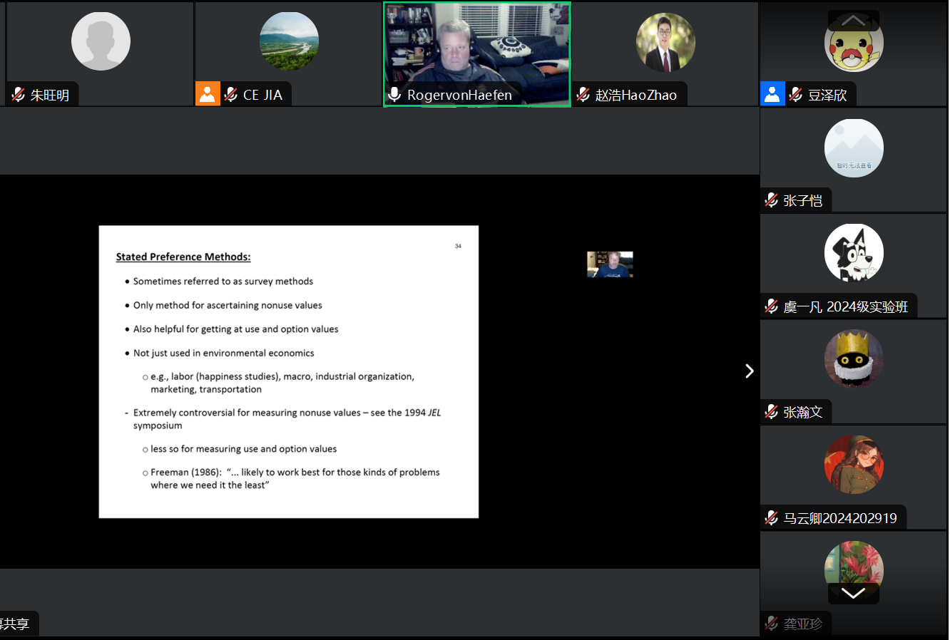 2024年9月22日,黑料正能量 主办的暑期学科营讲座以线上的方式成功举办。本次讲座邀请北卡罗来纳州立大学农业与资源经济学系教授、环境与资源经济政策中心联合副主任,资源与环境经济学顶级期刊JEEM联合主编Roger H. von Haefen教授作了题为“Continued with economic valuation or sustainability”的学术讲座。讲座由黑料正能量 赵浩助理教授主持。这是Roger H. von Haefen教授第二次为黑料正能量 主办的暑期学科营开展讲座。