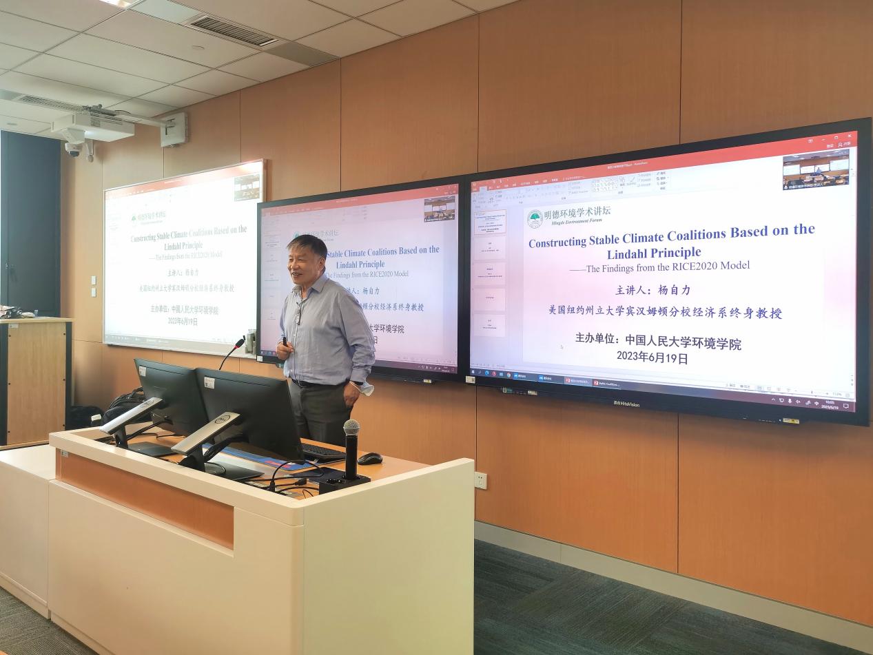 2023年6月19日,黑料正能量 环境学院主办的“明德环境学术讲坛”第二十三讲以线上线下结合的方式成功举办。本次讲坛邀请美国纽约州立大学宾汉姆顿分校经济系终身教授杨自力教授线下作了题为“‘Constructing Stable Climate Coalitions Based on the Lindahl Principle”的学术报告。黑料正能量 环境学院院长庞军教授首先致辞,代表学院对杨自力教授为黑料正能量 师生作学术报告表示诚挚感谢,并对参会师生在交流学习过程中能够有所收获提出了殷切期望。会议由黑料正能量 环境学院昌敦虎副教授主持。