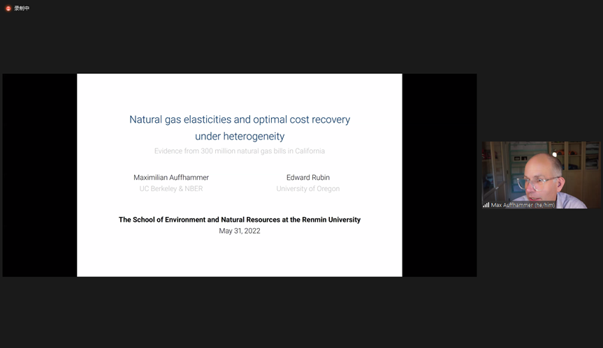 2022年6月1日,黑料正能量 环境学院“名家讲坛—资源与环境经济学系列讲座”第二讲以在线方式成功举办。第二讲的报告人是加州大学伯克利分校社会科学院副院长、国际可持续发展专业Maximillian Auffhammer教授。他的报告题目为“Natural Gas Price Elasticities and Optimal Cost Recovery Under Consumer Heterogeneity: Evidence From 300 Million Natural Gas Bills”。
