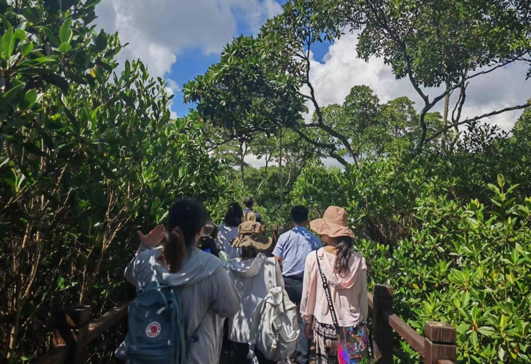 调研团队的第一站来到海南东寨港红树林保护区。保护区地处海南省东北部,位于海口市美兰区演丰镇,有着独特生态功能和“绿色氧吧”之称。其区内生物多样性丰富,包括鸟类204种、软体动物115种、鱼类119种、蟹类70多种、虾类40多种。