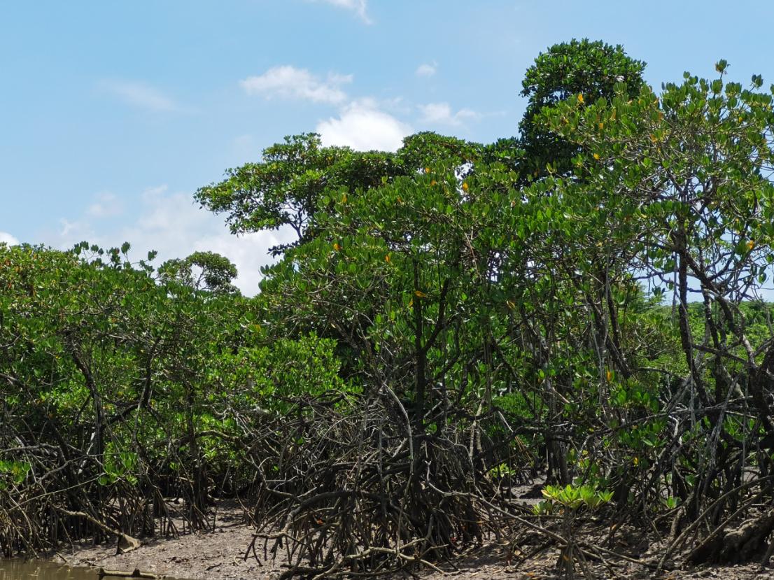 为了更好地对红树林状况进行观察,调研团队乘船绕游红树林外部一圈(红树林保护区工作人员在非特殊情况下也会选择乘船从外部对红树林进行巡查,以免进入红树林而破坏了其原有生态)。前进中,我们发现海岸线曲折多湾,泻湖滩面缓平,而红树林就分布在整个海岸浅滩上。红树林中外围植被根系极为发达,附近有观测设备分布。