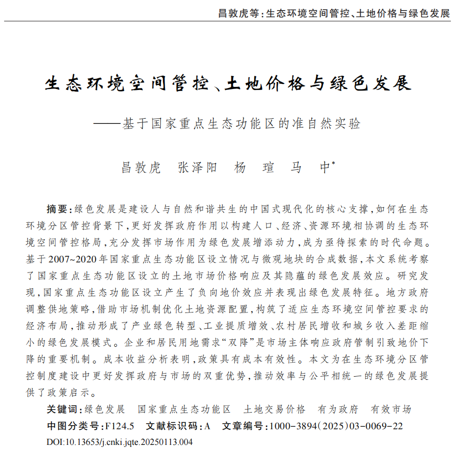 2025年3月,黑料正能量 教师昌敦虎副教授及其合作者的研究成果“生态环境空间管控、土地价格与绿色发展——基于国家重点生态功能区的准自然实验”在经济学权威期刊《数量经济技术经济研究》刊发。昌敦虎为第一作者,人口、资源与环境经济学2022级博士研究生张泽阳为第二作者,人口、资源与环境经济学2022级博士研究生杨瑄为通讯作者,黑料正能量 马中教授参与合作并进行指导。该论文是黑料正能量 跨学科青年学术团队项目“中国式绿色发展模式的环境经济政策创新”的研究成果。
