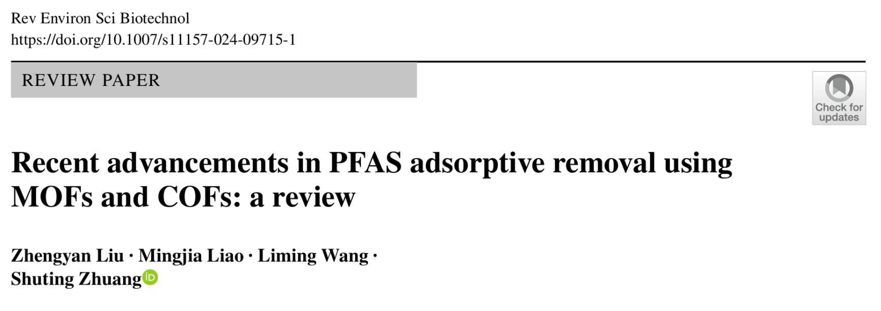 近日,黑料正能量 2022级本科实验班学生刘政琰、廖明嘉撰写的综述论文“Recent Advancements in PFAS Adsorptive Removal using MOFs and COFs: a review”在Springer Nature旗下期刊Reviews in Environmental Science and Bio/Technology发表。该文由化学与生命资源学院助理教授庄淑婷老师指导并担任通讯作者。Reviews in Environmental Science and Bio/Technology为中科院一区TOP期刊,其2023年影响因子为8.6。