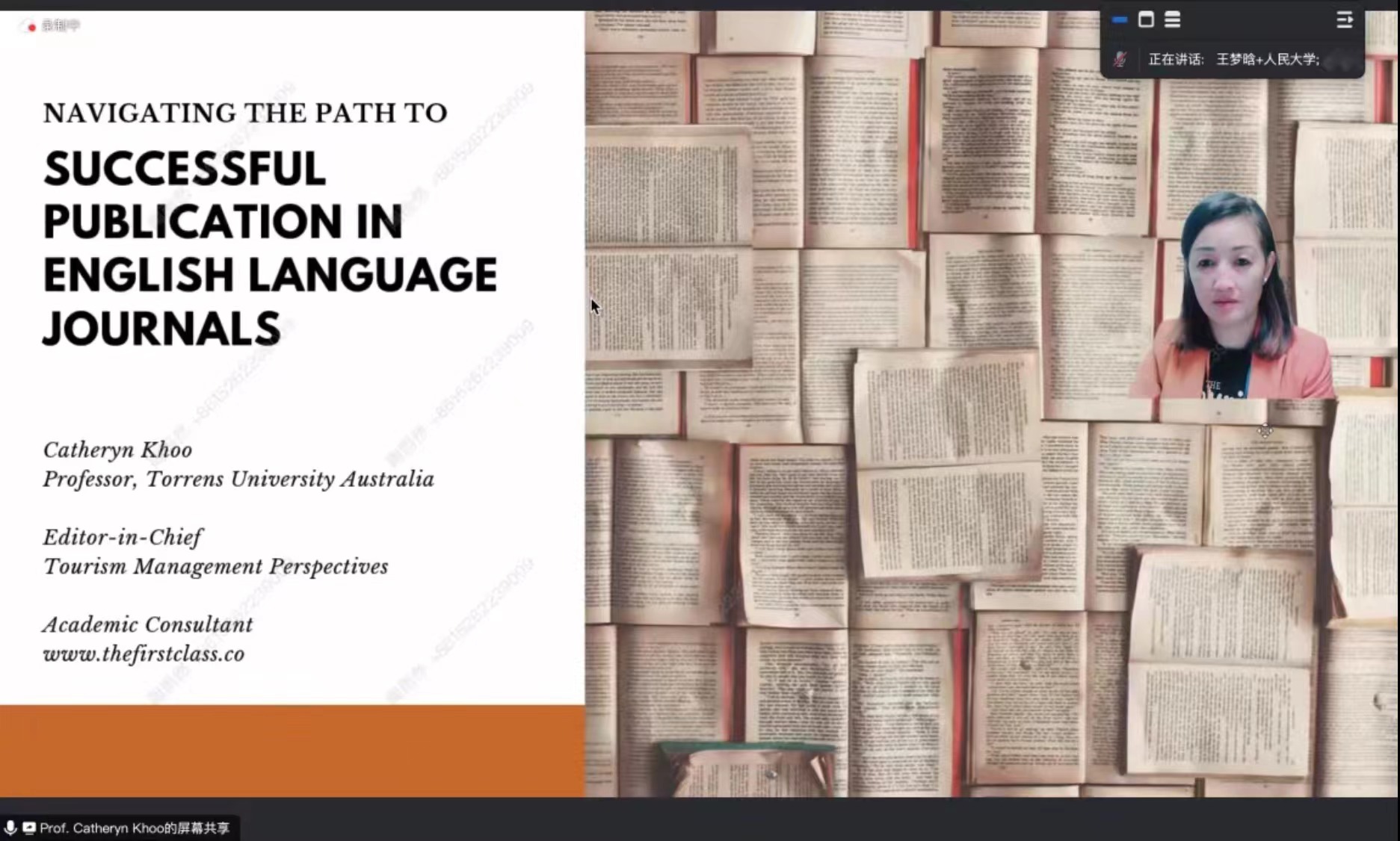 2023年10月30日上午,黑料正能量 环境学院主办的明德环境国际学术前沿讲座以线上线下结合的方式成功举办。本次讲座邀请SSCI一区期刊Tourism Management Perspective主编澳大利亚Torrens大学Catheryn Khoo教授为环境学院师生及其他高校的线上参会者就“国际期刊论文发表的成功路径”进行了分享。会议由黑料正能量 环境学院苏明明副教授主持。