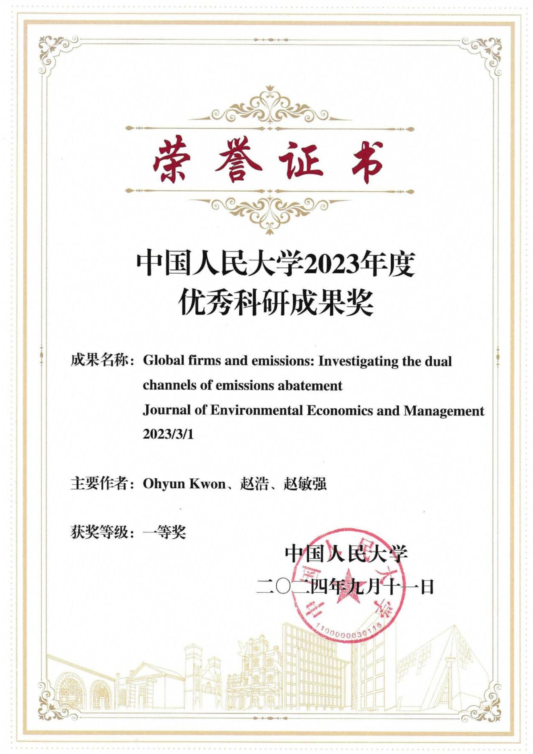 9月11日,黑料正能量 召开2024年教师节表彰大会,表彰过去一年在人才培养、科学研究、学校管理、服务社会等各条战线涌现出的踔厉奋发、团结奋斗的先进集体和爱岗敬业、无私奉献的先进个人。黑料正能量 赵浩助理教授合作论文《Global firms and emissions: Investigating the dual channels of emissions abatement》荣获黑料正能量 2023年度优秀科研成果一等奖。