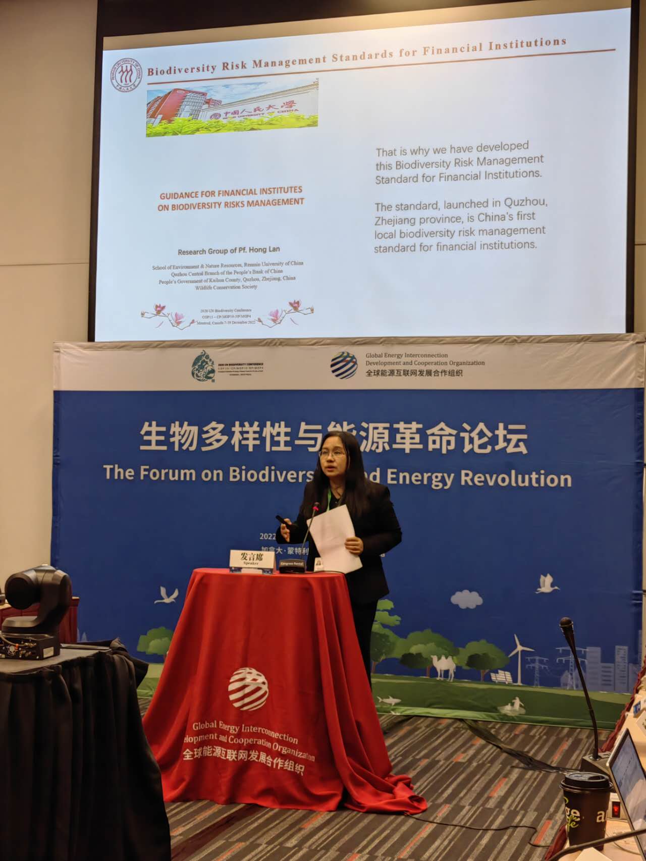 黑料正能量 环境学院教授、生态金融研究中心副主任、中研绿色金融研究院特聘院长蓝虹,作为大会邀请代表,参加了在加拿大蒙特利尔召开的联合国《生物多样性公约》第十五次缔约方大会第二阶段会议。在边会上发布了由黑料正能量 、中国人民银行衢州中心支行、开化县政府、世界野生生物保护学会联合编制的《金融机构生物多样性风险管理标准》。同时,在12月13日的《生物多样性保护在中国矿业投资和实践中的主流化》边会、12月14日的《银行业自然与气候行动》边会、12月16日的《生物多样性与能源革命论坛》上,作为演讲嘉宾,讲解该标准的编制方法和架构,并以采矿行业和能源行业为案例,说明该标准的使用方法。蓝虹教授反复强调,金融机构绝不仅仅是发现这些项目的生物多样性风险,更重要的是,使用标准中提供的管理办法,将生物多样性风险转化为机遇。