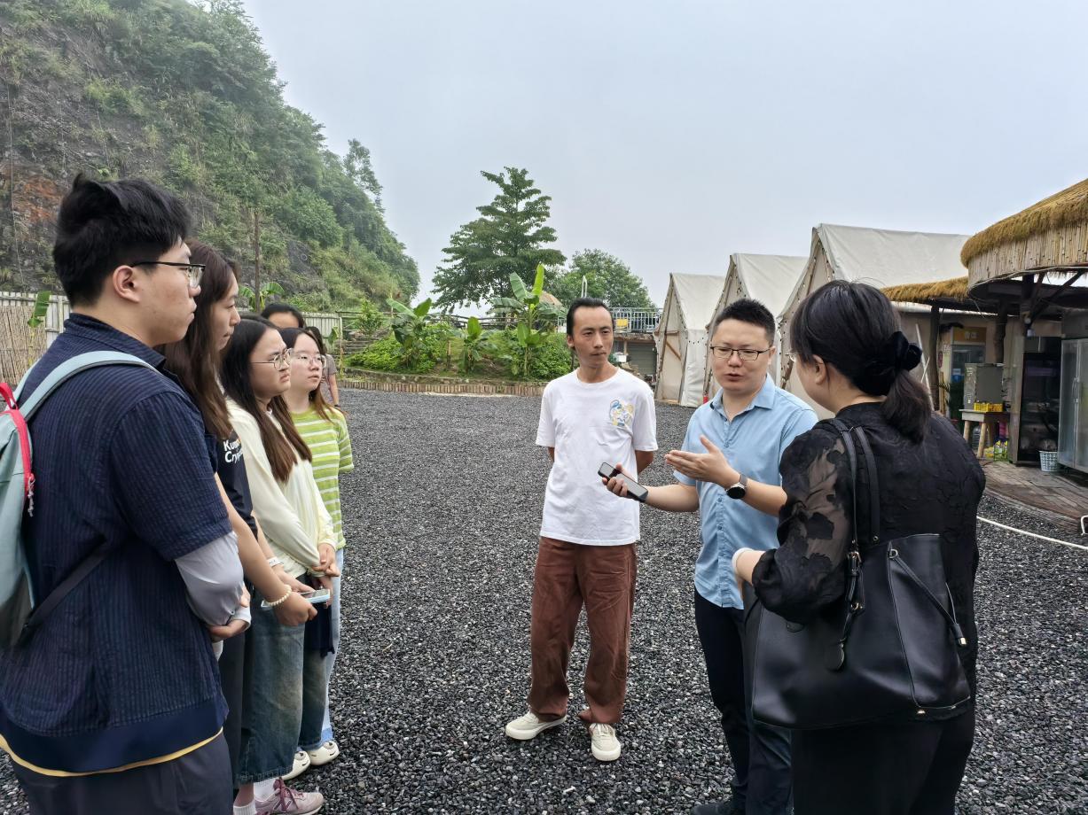 7月24日上午,调研团队前往绥山镇太阳村和荷叶村,调研文旅融合相关情况。太阳村海拔1200米,森林覆盖率达92%,凭借避暑、观星、赏夕阳的天然优势,为露营经济发展筑牢基础。调研发现,太阳村露营基地呈现差异化发展特点:有的聚焦烧烤、火锅等美食体验;有的面向亲子家庭,配套沙池、滑梯等儿童游乐设施,并用集装箱改造出咖啡店。舒适的露营环境推动当地露营经济快速兴起,成为网红打卡地,既带动村民就业,也拓宽了农产品销售渠道,让村民切实受益。毗邻的荷叶村,在700至1500米的山地间舒展画卷,85%的森林覆盖率与18℃年均气温,勾勒出康养度假的理想轮廓。这里以“国资+村集体+运营公司”模式为笔,将传统民居晕染成高端民宿,联动茶园、竹园、果园开发采茶制茶、挖笋编竹等农事体验,发展矿山咖啡、山溪烧烤等新业态。调研中,师生共同参观了一处由废旧采矿场改造的咖啡馆,其既保留老矿场历史风貌,又融入现代设计元素,让工业记忆在文旅新业态中焕发新生。