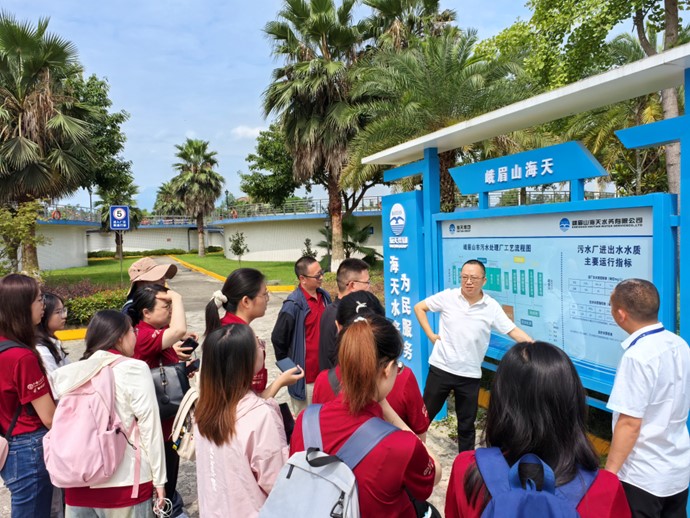 7月22日上午,调研团师生首站探访国家试点EOD项目核心载体—海天污水处理厂,海天污水处理厂运行工程师李迪向全体师生进行了介绍。作为EOD试点重要组成,该厂践行“生态治理+区域开发”协同理念,以工艺创新推动环境治理。采用改良A²/O+活性砂过滤+紫外消毒工艺,配套反硝化深床滤池,通过投加碳源与除磷剂强化脱氮除磷,出水稳定达一级A标准,显著改善流域水质,为区域生态修复与开发奠定基础。师生通过调研访谈加深认识:污水变净水的蜕变,既是“绿水青山就是金山银山”的实践,更彰显EOD模式优势——实现生态保护与经济发展良性循环,为可持续发展提供支撑。