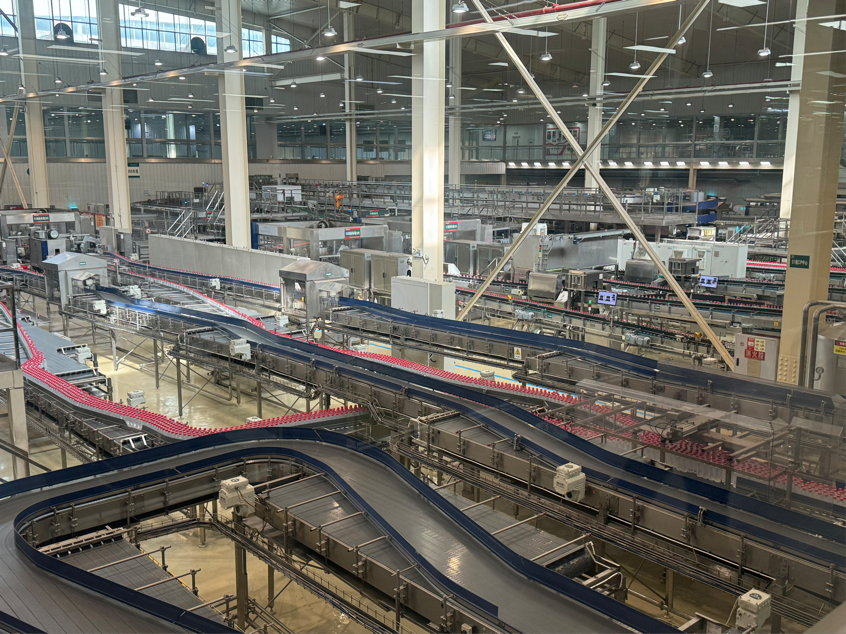农夫山泉峨眉山工业旅游示范基地作为国家4A级景区与绿色工厂,依山傍水而建,其朱墙添绿瓦的设计风格,与这里的山间树林融为一体,同时也构建了“可玩可看可学可购可品可闲”的工业旅游复合运营生态。其核心载体透明化流水线参观廊道,完整呈现饮品从过滤、吹瓶、灌装到包装的全流程。基地通过生产场景开放与生态理念渗透,历经8年勘探、6年建设后,峨眉山当地的天然水从农夫山泉工厂流向了西南地区的千家万户,实现工业生产与科普教育的有机融合,成为“一桶水”品牌价值落地的重要支撑。结合工作人员的讲解,调研团队近距离观察智能化流水线高效运作,对进一步探索实现经济效益与生态效益双赢的“绿色密码”有了直观且深刻的认识。