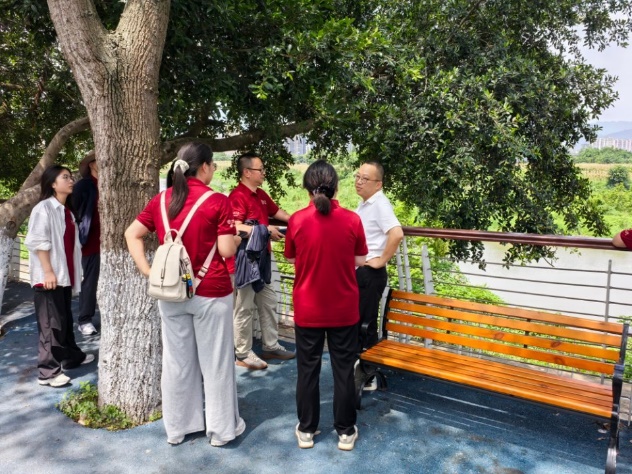 调研团一行深入东湖湿地公园开展调研,探访这座EOD项目生态修复典范的实践成果。通过峨眉山市生态环境局党组成员尹新的详细介绍,师生一行了解到,作为EOD模式中生态治理与价值转化的关键载体,公园以“生态修复为基、功能融合为要”,通过系统性湿地修复工程,构建起完整的生态净化体系。如今的湿地公园内,绿树成荫、碧波荡漾,成群白鹭在水面翩翩起舞,这幅生机盎然的图景正是EOD实践的生动注脚——通过水质净化、植被修复等生态治理措施,不仅重塑了湿地生态系统,更将生态优势转化为发展动能。