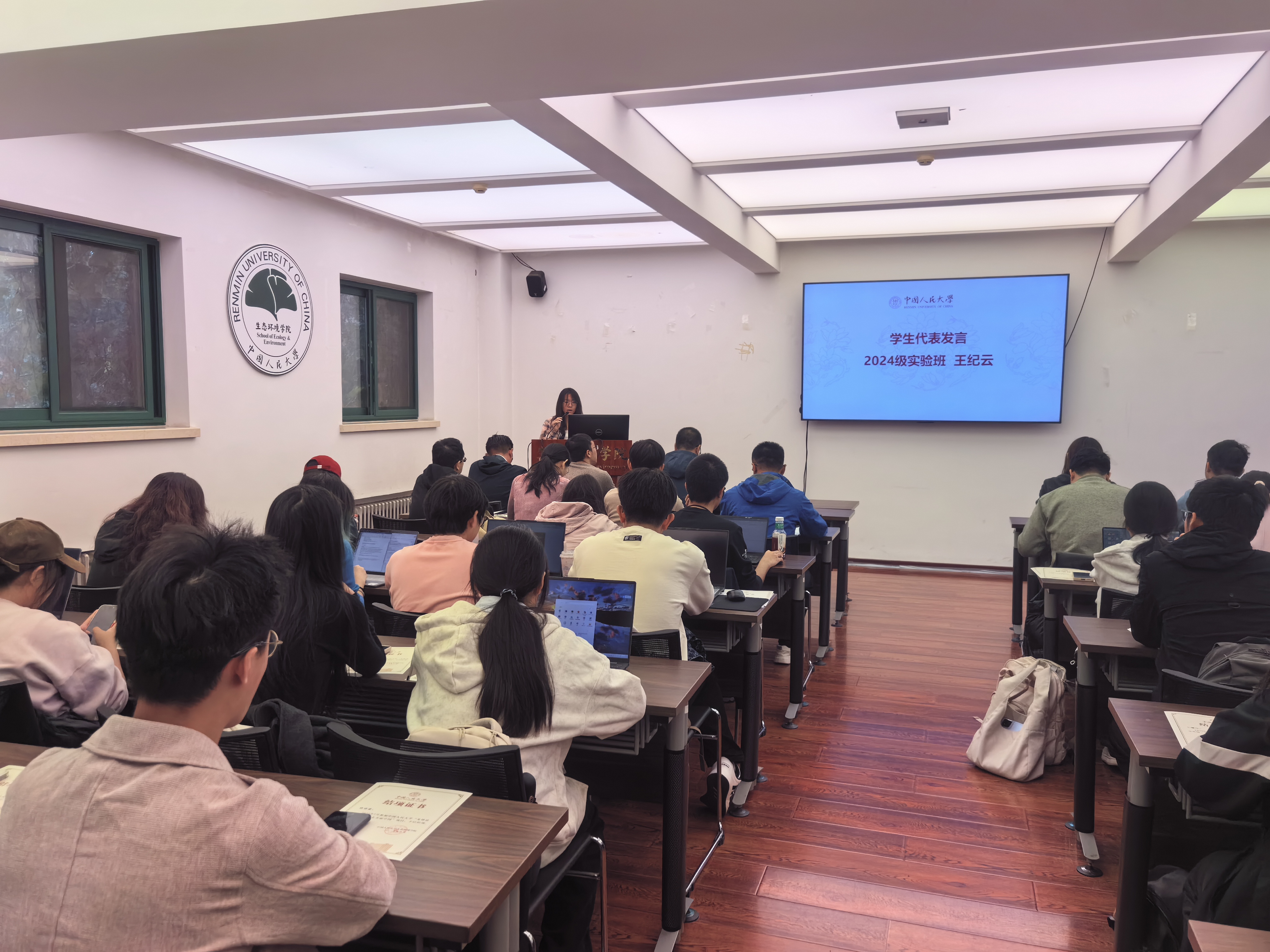 获奖学生代表、2024级明德环境“经济学-科学”实验班王纪云分享调研见闻与心得。她从“出发”的缘起讲起,提及课堂中对鄂尔多斯“资源型城市”的固有认知,以及参与调研后探寻其在“双碳”目标下发展路径的迫切期待。在“行走”的见闻中,她重点介绍鄂尔多斯的绿色蜕变:巴日图塔村的天骄绿能50万千瓦光伏项目,让4.2万亩采煤沉陷区变成蓝色光伏“海洋”;当地以绿色制砖技术将煤矸石“废料”转化为“金砖”;零碳产业园与风光储一体化项目成为转型核心引擎,让“新质生产力本身就是绿色生产力”的理念落地生根。此外,昌茂绿怡生态农场的绿色种植、敏盖绒山羊繁育中心的现代化养殖,也让她深刻理解“绿色发展是高质量发展的底色”,并承诺将以青年之力成为绿色理念传播者、生态创新探索者与可持续发展践行者。