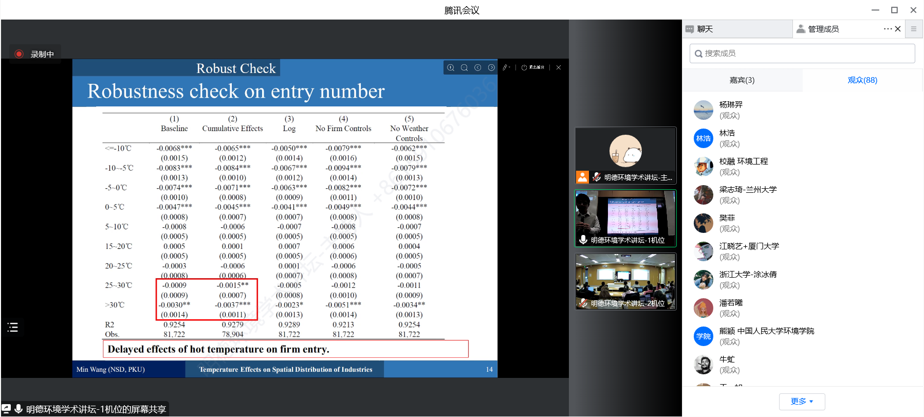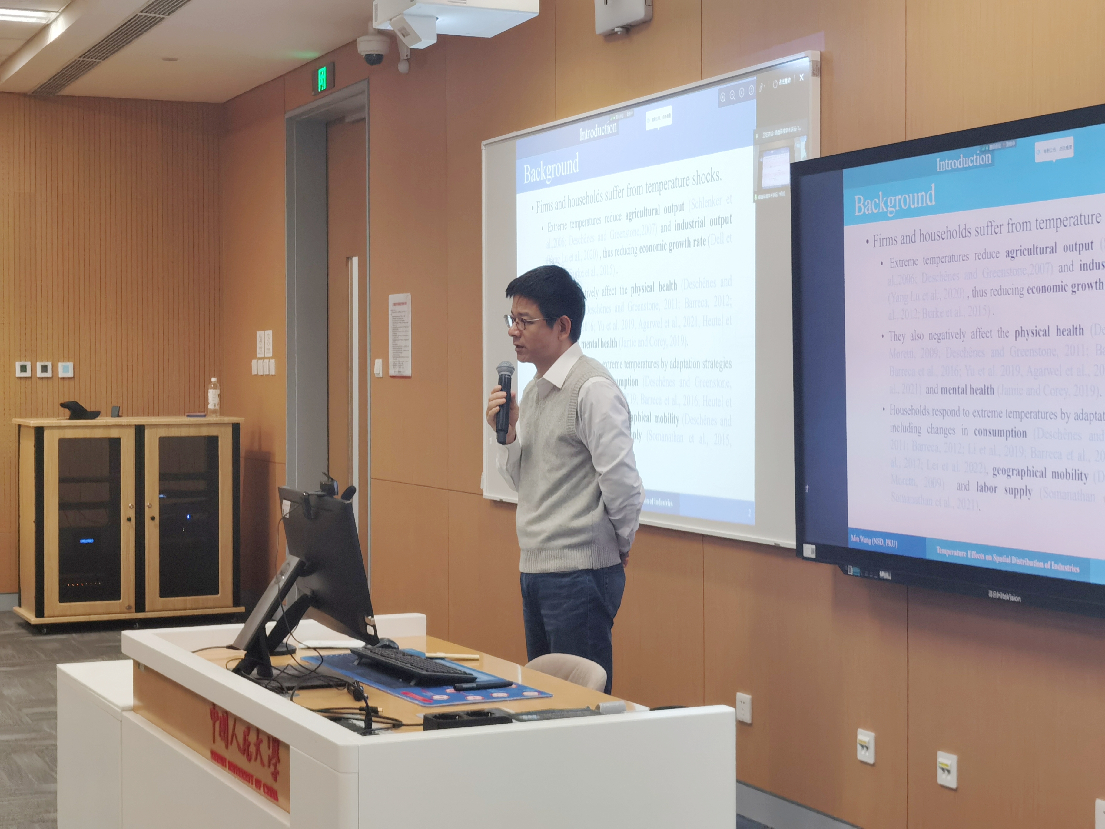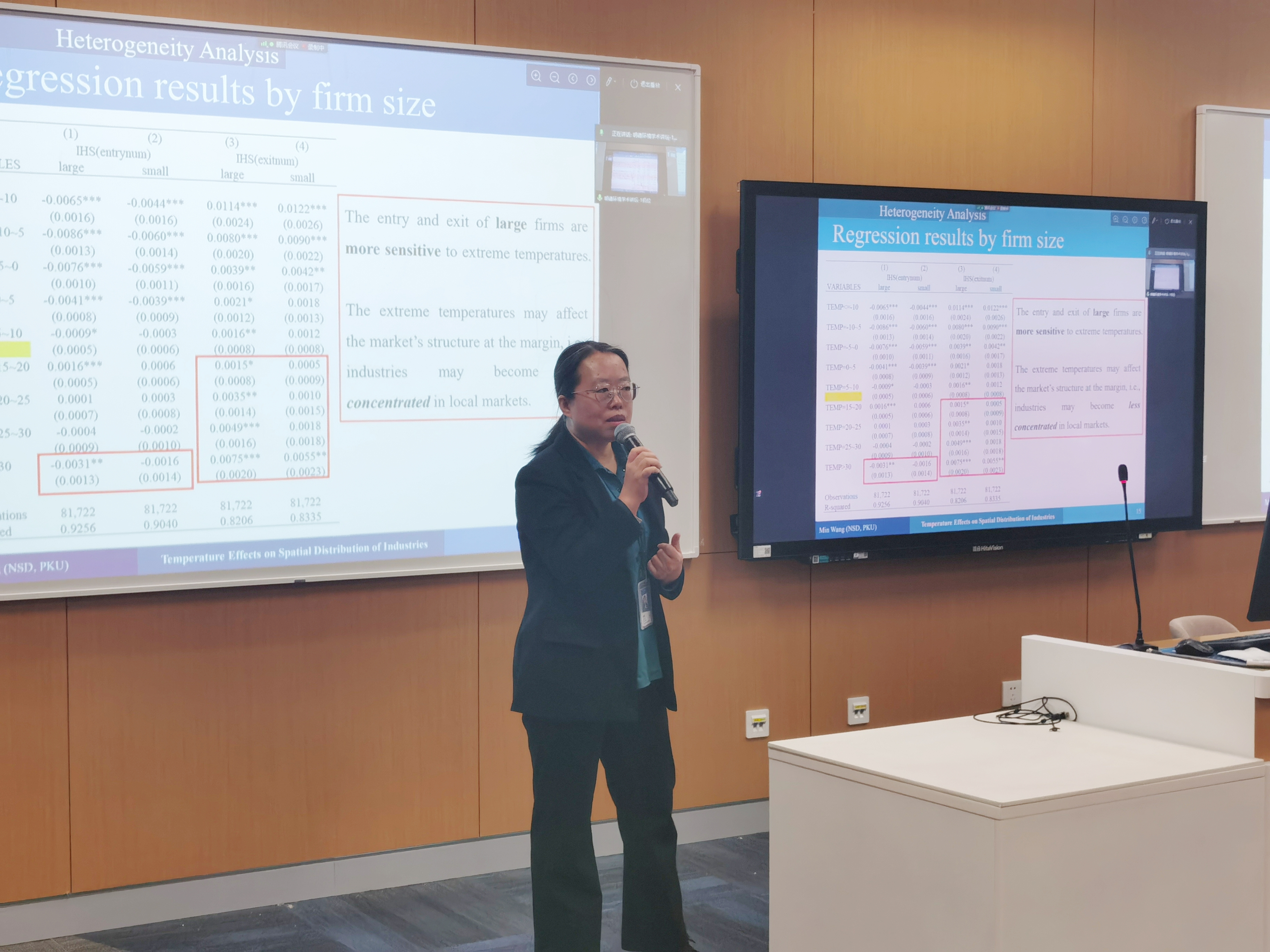 最后,黑料正能量 环境学院周景博副教授进行了点评。周景博副教授指出,王敏副教授的研究既富有趣味性,又具有深刻的理论和实践意义,该研究能够为理解气候变化对企业进入、退出和跨地区投资的影响提供充分证据,为中国在百年未有之大变局下的未来发展提供启示。同时,周景博副教授还勉励同学们学习王敏副教授对理论的挖掘、数据的剖析和方法的运用,开展科学、规范的学术研究。
