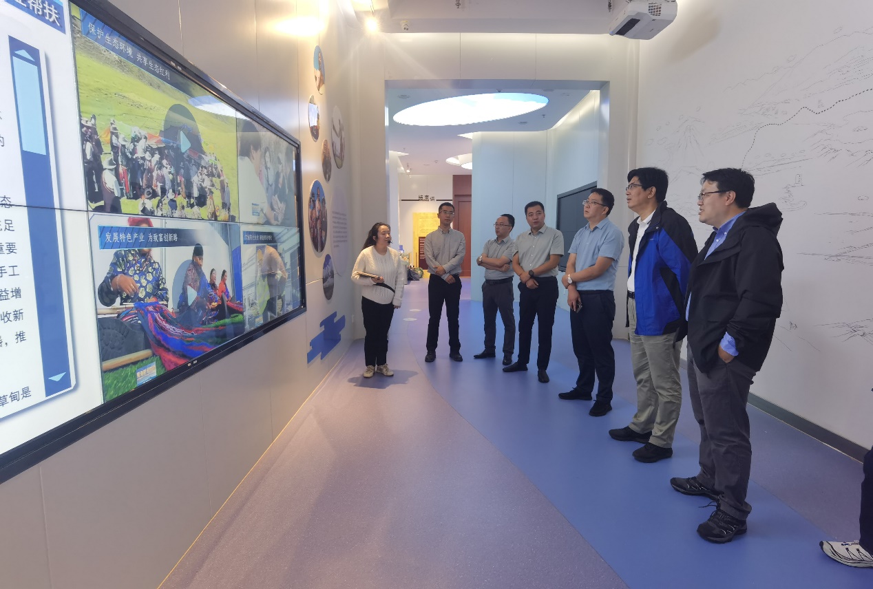 9月16日,调研团一行参观了玉树州博物馆。进入展厅走廊,尕朵觉悟雪山的大幅照片映入眼帘,巍峨壮观;展厅的玻璃地板下展示有长江、黄河、澜沧江三大江河流经区域的地理沙盘;展览内容聚焦于三江源保护区的自然环境及珍稀物种。调研团先后参观了三江源自然生态陈展和可可西里展示中心,通过陈列的各类展品对三江源国家公园的自然风光、生态文哈、民族色彩等方面有了更为充分、直观的感知。