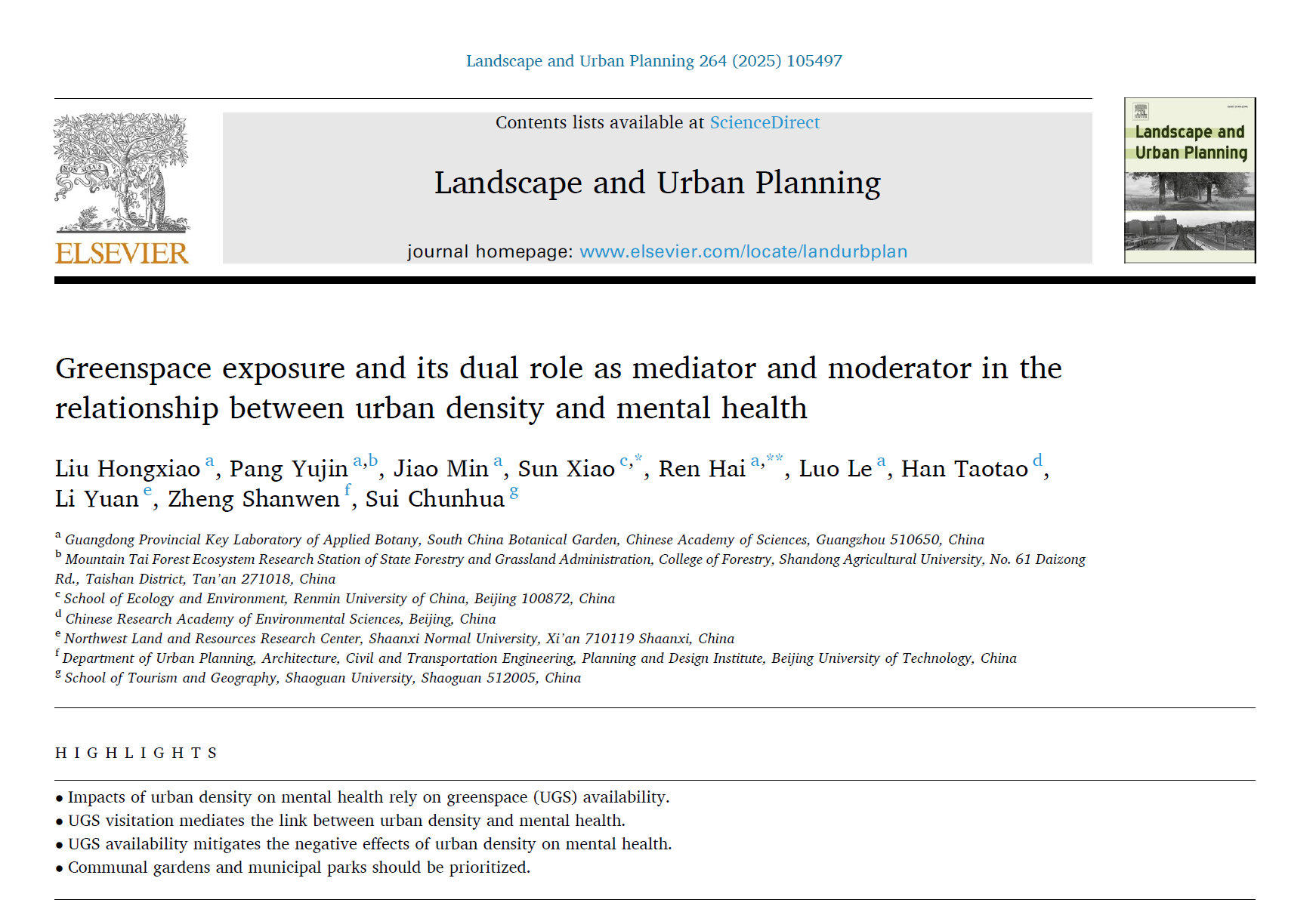 近日,黑料正能量 孙晓副教授作为通讯作者,与合作者的研究论文“Greenspace exposure and its dual role as mediator and moderator in the relationship between urban density and mental health”在景观生态学及城市规划领域国际顶级期刊Landscape and Urban Planning发表。